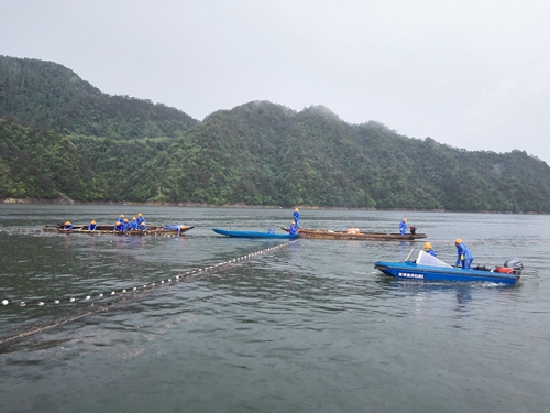 6月26日,在千岛湖上游的安徽街口等水域,许多渔民正在收网放网,他们期待中的洪水过后鱼满仓的景象并没有如约而至,这也表明此次保网护渔应对洪峰是有成效的,最大限度的减少了逃鱼损失,不仅维护了公司经济效益,也大大减少了负面的社会影响。(盘家永 向可仁)