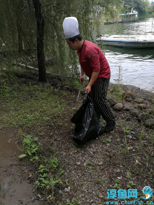 千岛湖鱼味馆渔人码头店对沿湖垃圾进行清理