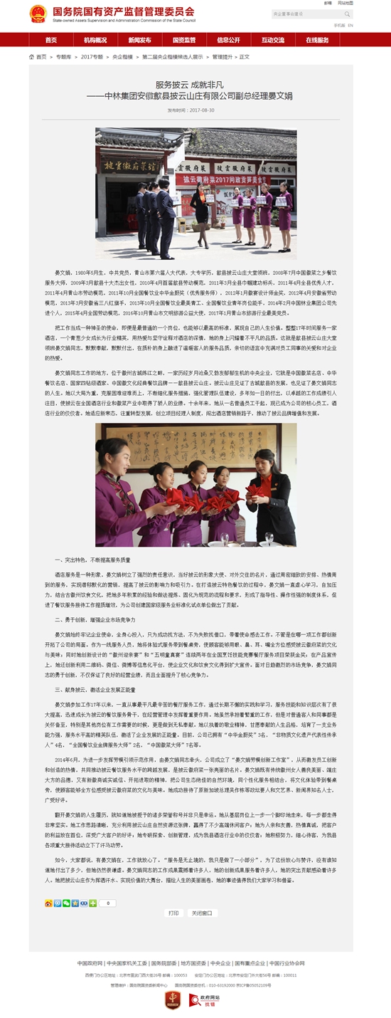 日前,国务院国资委网站刊登千发集团下属两大餐饮品牌之一的披云山庄副总经理晏文娟入选第二届央企楷模候选人的先进事迹