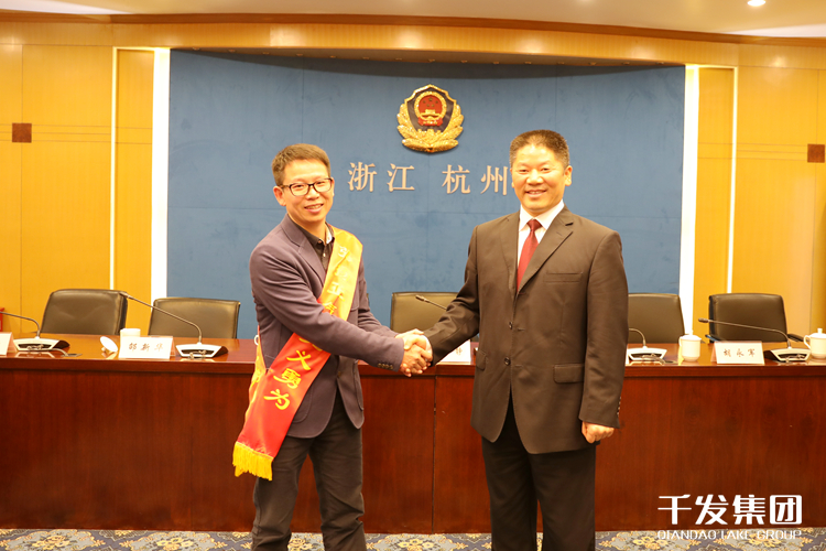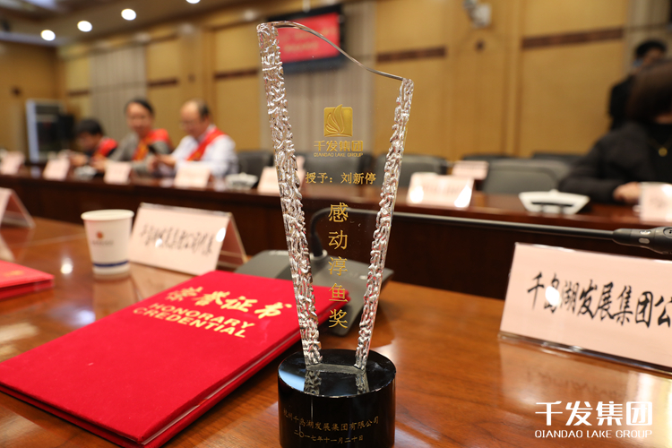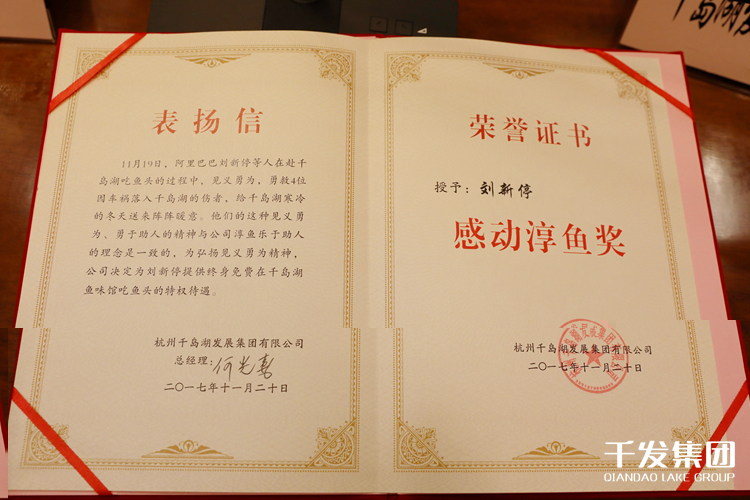 11月29日,在杭州市公安局召开表彰大会,杭州市见义勇为基金会和淳安县人民政府共同隆重表彰刘新停见义勇为奖。千发集团总经理何光喜授予刘新停“感动淳鱼奖”,并代表千发集团宣布对刘新停个人给予终身免费在千岛湖鱼味馆吃鱼头的特殊贵宾待遇。这也是公司成立以来首次颁发此奖项。此外公司还分别奖励阿里巴巴其他7名参与救援的同志每人一张千岛湖鱼味馆贵宾卡。