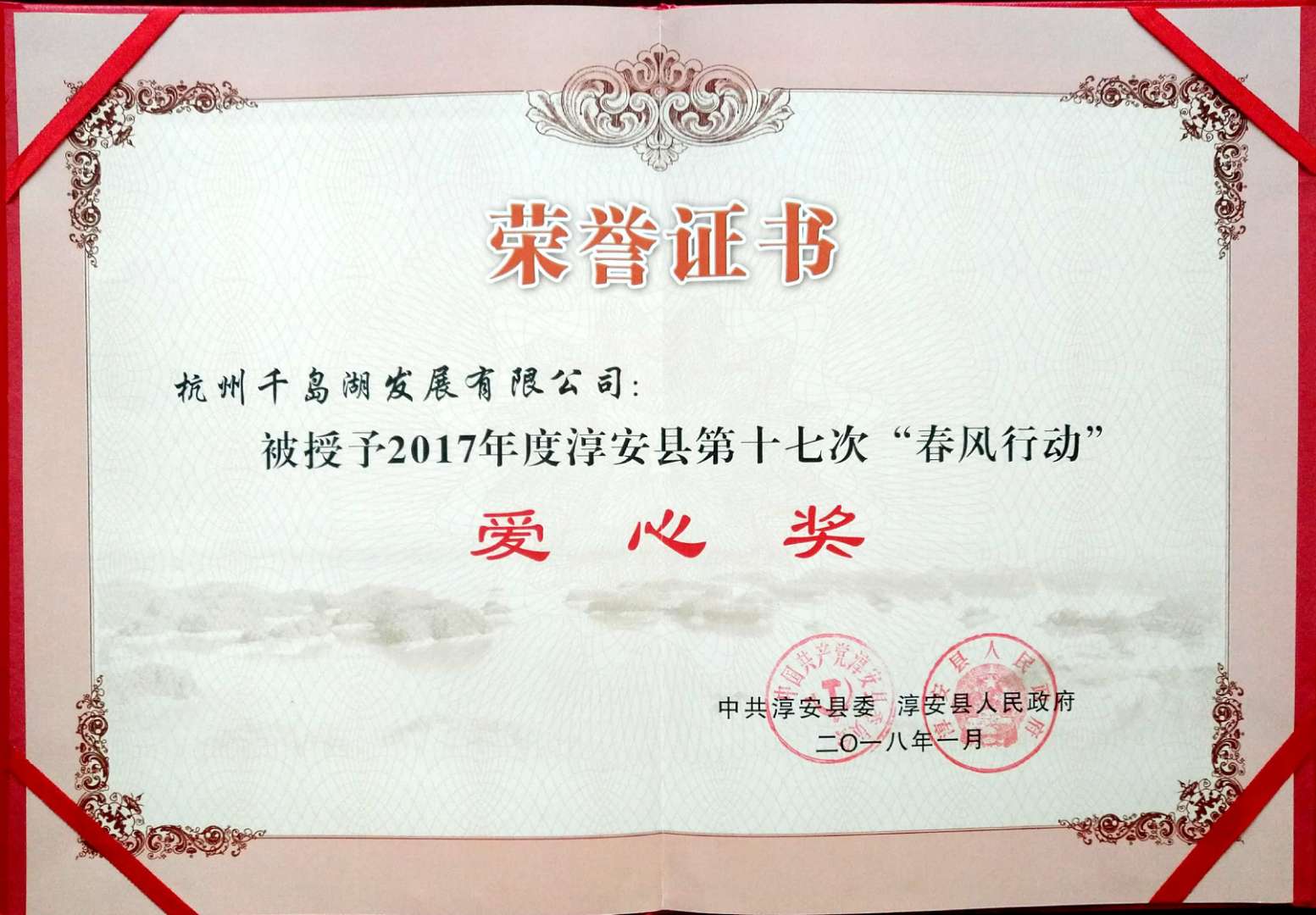 日前,千发集团被淳安县委、县政府授予2017年度淳安县第十七次“春风行动”爱心奖荣誉。