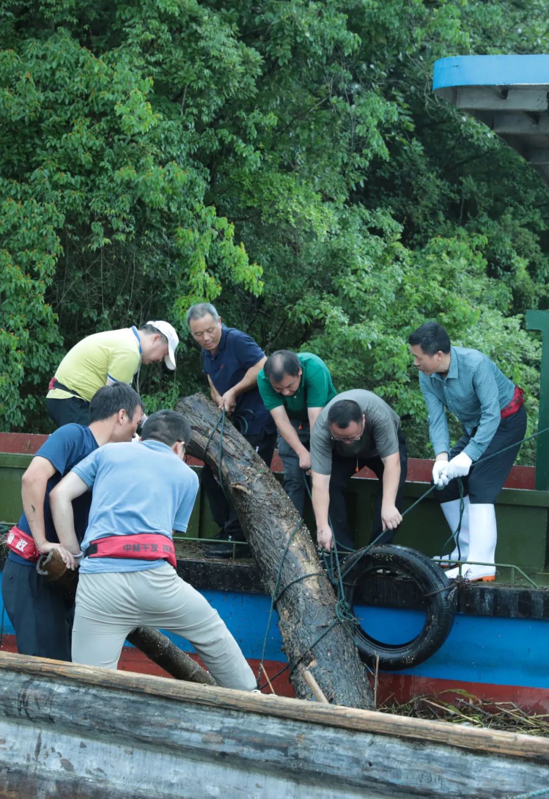 在处理这些浮木时,队员们肩扛、背负、手抱,或是利用绑绳合力将那些沉重的大树木从水中奋力拖曳而出。