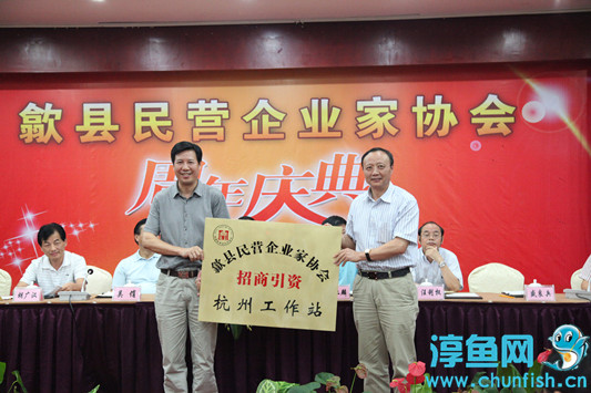 中共歙县县委书记胡仕圣同志到会并作重要讲话。会上还举行了关于成立招商引资杭州工作站的授牌仪式。最后,参会人员共举酒杯,共享歙县披云山庄精心准备的晚宴,并欣赏着“周年庆典活动”专场文艺演出。(潘旻)