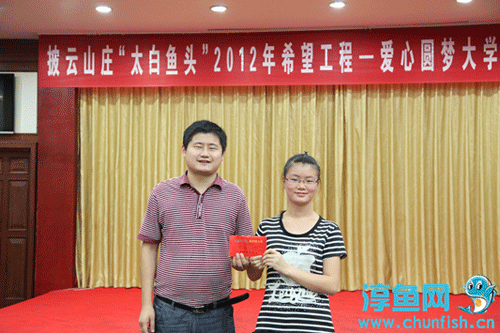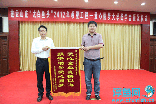 最后,歙县披云山庄有限公司总经理方东进接受了团县委和县希望工程办公室赠送的锦旗——“爱心企业真情似海,捐资助学爱心圆梦。”歙县披云山庄从2006年开展“太白鱼头”助学活动以来,帮助数十名学生得以继续完成学业,产生了广泛的社会影响。今后,我们也将继续秉承“得益社会、回报社会”的理念,将爱心播撒给更多需要帮助的人!(潘旻)